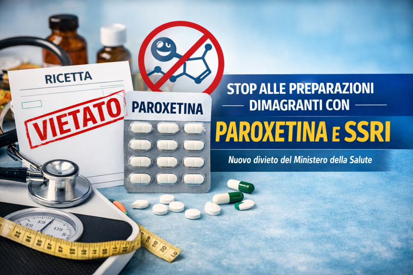 Con decreto del 30 dicembre 2025, pubblicato nella Gazzetta Ufficiale del 17 gennaio 2026, il Ministero della Salute ha disposto un divieto importante: i medici non possono più prescrivere e i farmacisti non possono più preparare preparazioni galeniche (magistrali) a scopo dimagrante contenenti paroxetina o altri principi attivi della classe degli inibitori selettivi della ricaptazione della serotonina (SSRI).