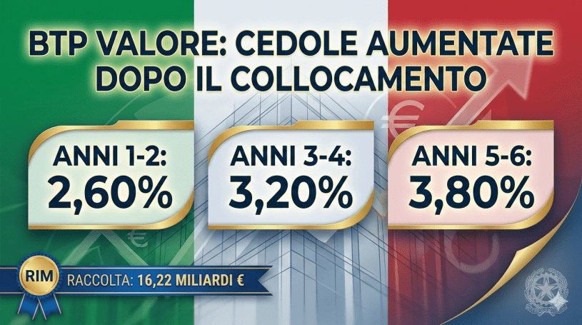 Il Ministero dell’Economia e delle Finanze ha comunicato i rendimenti definitivi della nuova emissione di Btp Valore, al termine della fase di collocamento. I tassi sono stati ritoccati verso l’alto rispetto ai livelli minimi inizialmente indicati, offrendo condizioni più vantaggiose per i risparmiatori che hanno sottoscritto il titolo.