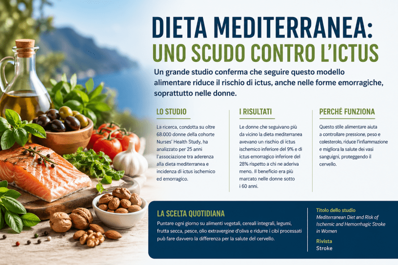 Un importante studio scientifico pubblicato nel 2026 sulla rivista peer-reviewed WN9 – Neurology and Clinical Neuroscience ha aggiunto nuove prove a favore della dieta mediterranea come strumento di prevenzione cerebrovascolare. Il lavoro, intitolato “Mediterranean Diet and the Risk of Stroke Subtypes in Women”, mostra che le donne che seguono più da vicino questo modello alimentare hanno un rischio più basso di ictus, non solo nella forma ischemica — la più frequente — ma anche in quella emorragica.